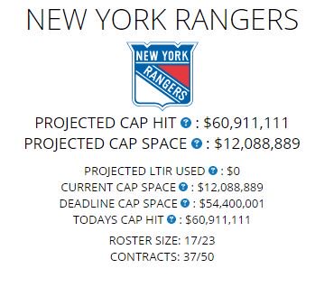 Team roster, salary, cap space and daily cap tracking for the new york rangers nhl team and new york rangers.